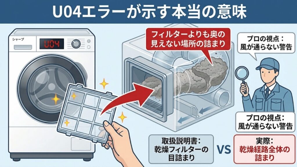 洗濯機は、「フィルターが汚れている」ことを目で見て判断しているわけではありません。内部のセンサーが「風の流れが悪い」ことを検知した時に、ユーザーが唯一対処できる場所として「フィルターを見てください」というメッセージ(U04)を出しているに過ぎません。